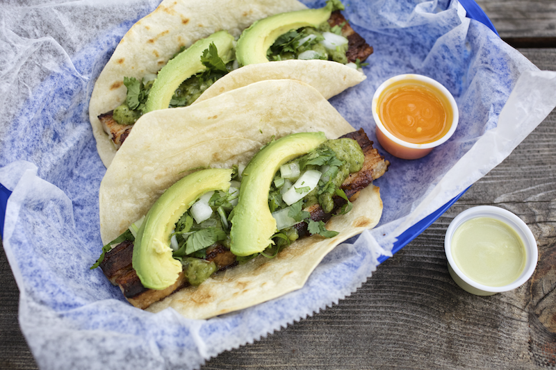 Pork belly, Goodflow Honey tomatillo-serrano salsa, avocado, cilantro, onion