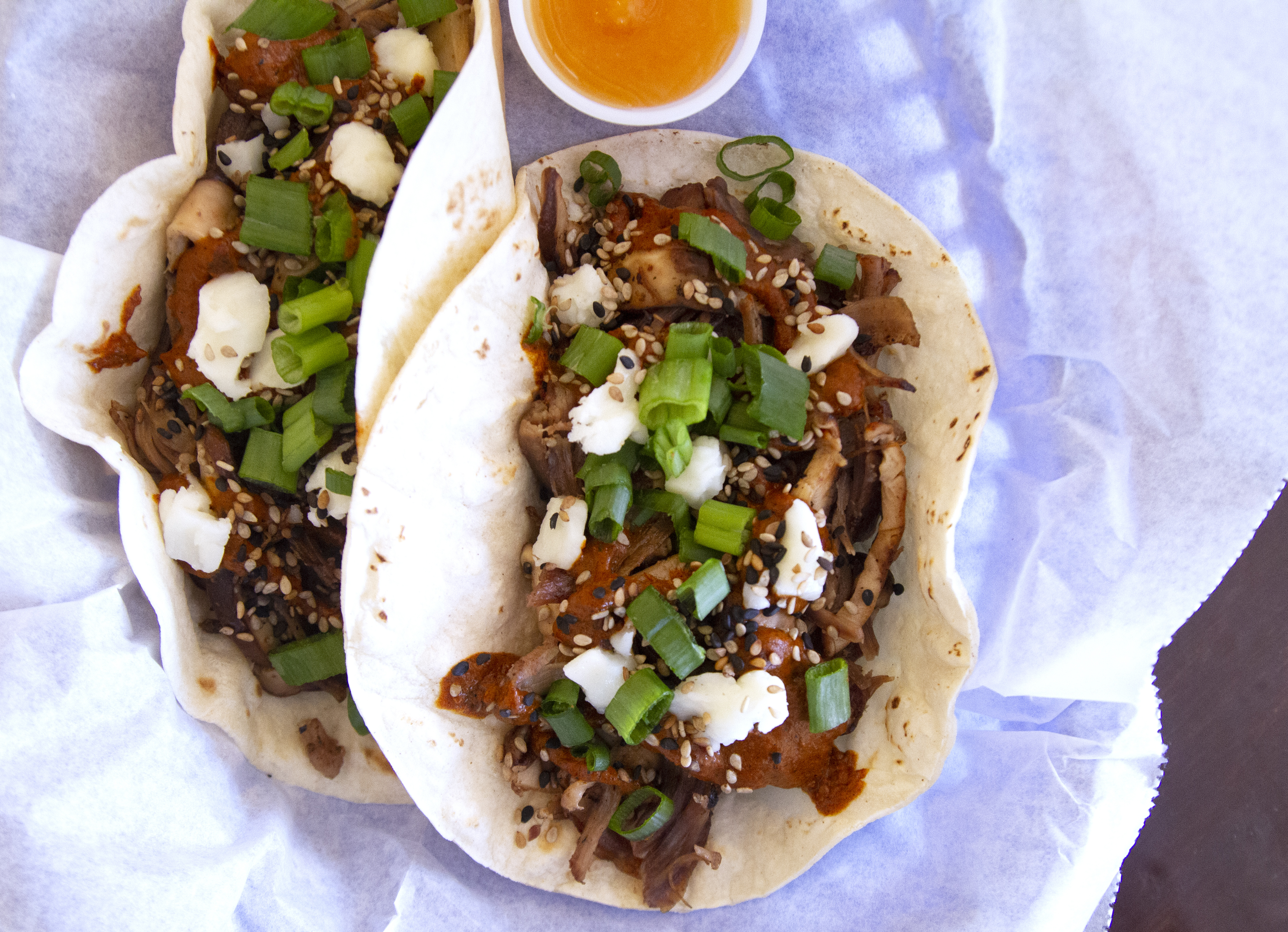 Slow-Roasted Capra Lamb Shoulder (Goldwaithe, TX), Kitchen Pride Shiitake Mushrooms (Gonzales, TX), Chile-Forward Mole, Honey Doe Farms & Creamery Goat’s Milk Queso Fresco (Madisonville, TX), Toasted Sesame Seeds, Green Onion