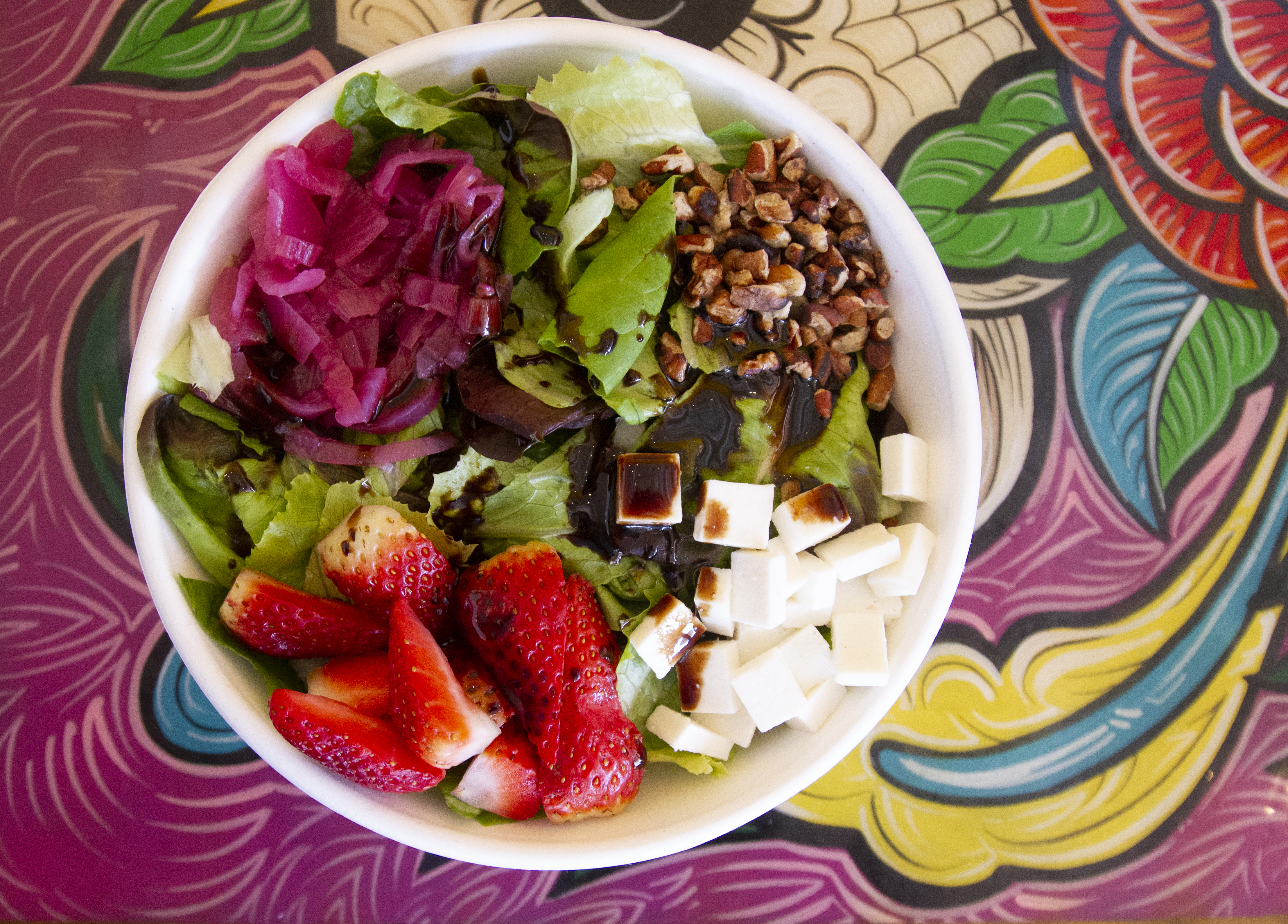 Leaf Safari Red & Green Butter Lettuce (Manor, TX), The Farm Patch Strawberries (Pleasanton, TX), Cheesemakers Queso Fresco (Cleveland, TX), Toasted Pecans, Pickled Red Onion, House-made Balsamic Dressing with 512 Tequila Blanco (Austin, TX)