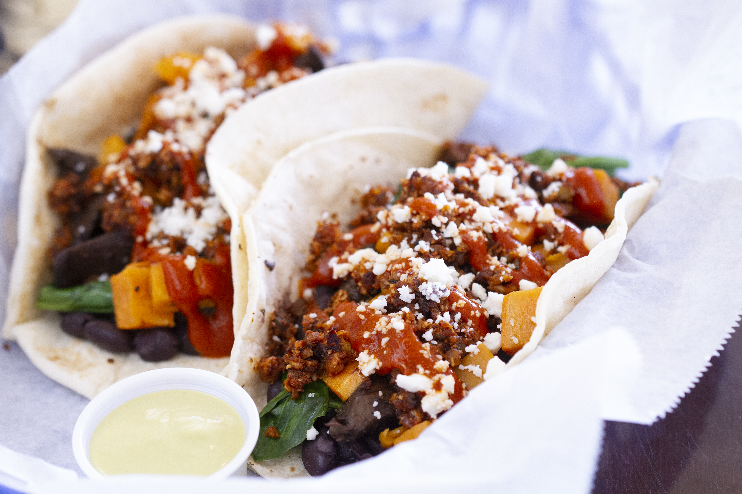 Vegan Nut Chorizo, Whole Black Beans, Sauteed Spinach, Kitchen Pride Portobello Mushrooms, Gundermann Acres Sweet Potatoes (Glen Flora, TX), Salsa de Arbol, Cheesemakers Queso Fresco (Cleveland, TX)